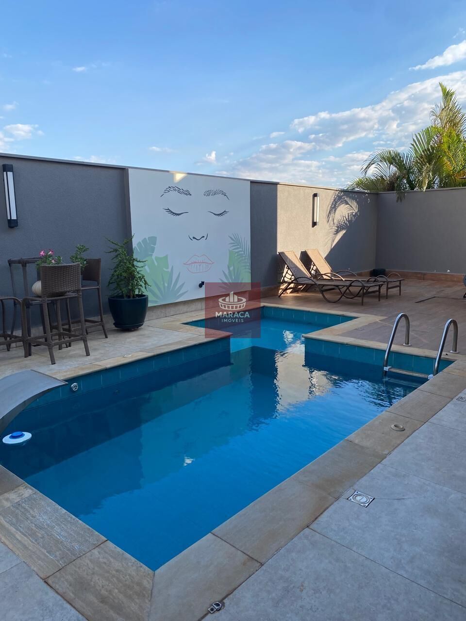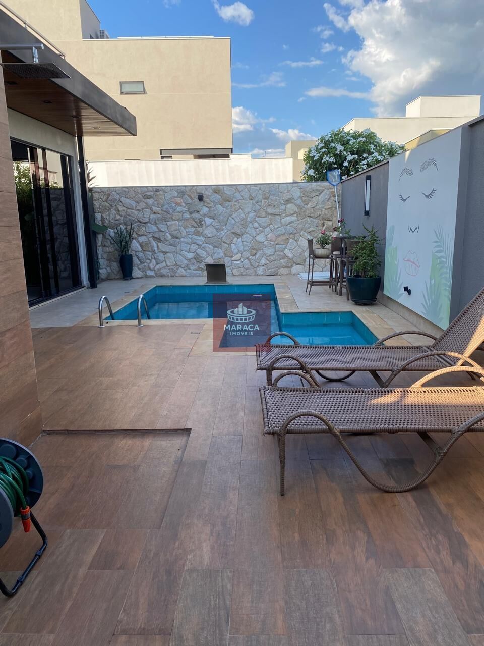 Área gourmet com churrasqueira integrada também a sala de jantar. Piscina aquecida com hidromassagem e luzes decorativas, banheiro externo.